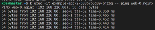위 StatefulSet을 통해 web-0, web-1, web-2 Pod이 순서대로 생성되며, 'serviceName'과 Headless Service를 추가하였으므로 'web-0.nginx'와 같은 이름으로 다른 Pod에서 접근이 가능하다.