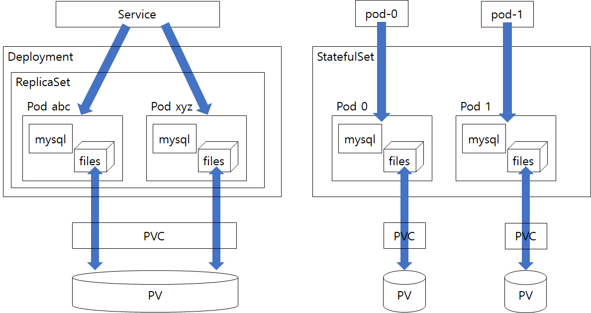 Deployment의 경우 모든 Pod이 동등하며 랜덤하게 관리되므로, 특정 Pod을 Master 또는 Slave로 지칭하거나, 우선순위를 부여할 수 없다. 또한 Service를 통해 접근시 Load Balancing이 발생하기 때문에 어떤 Pod에 연결될지 알 수 없다. 무엇보다 한개의 Persistent Volume과 Claim을 여러 Pod에서 가지려고 하는 문제가 발생한다.