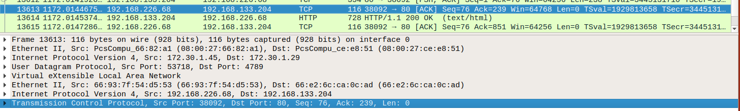 Underlying Network를 통해 전달받은 패킷의 UDP Datagram 안에 실제 Pod으로 보내는 Ethernet Frame이 들어있음을 확인할 수 있다. 또한 해당 프레임의 Src/Dst MAC 주소엔 각자 Host에 생성된 VXLAN 디바이스가 지정되어 있다. 이를 통해 각 Pod이 가상의 L2 Network 위에 연결된 것과 같이 동작한다.