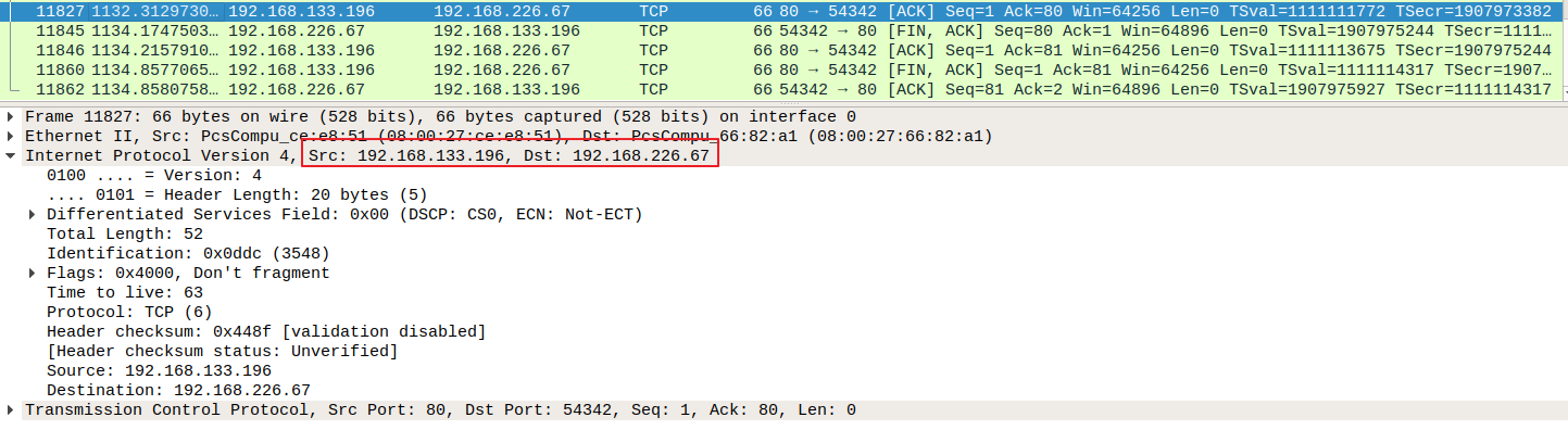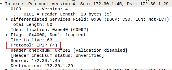 IP 패킷 내에 또 다른 IP 패킷이 존재함을 알 수 있다. Outer Packet의 경우, 각 Node IP가 Src/Dst로 지정되었으며, Inner Packet의 경우, 실제 Pod IP가 Src/Dst로 설정되었다. 한가지 재밌는 점은, Outer Packet의 IP Header를 확인해보면 아래와 같이 IPIP(프로토콜 #4)가 명시되어 있다는 사실이다.