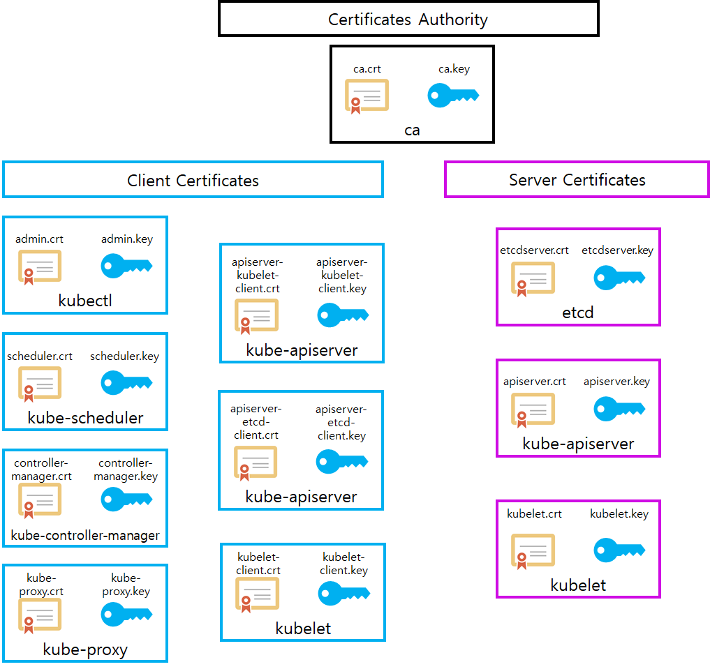 Kubernetes 역시 마찬가지로 각각의 Component마다 Certificate을 요구하며, 아래와 같이 독자적인 PKI(Public Key Infrastructure)를 구성한다.