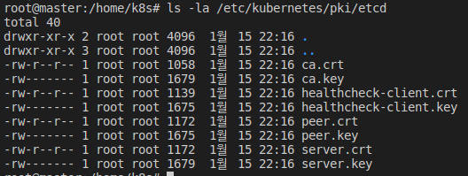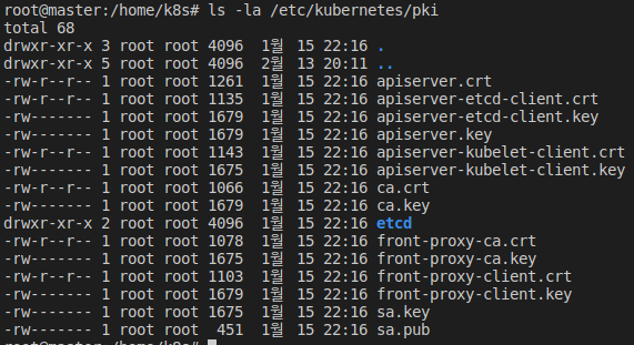 CA는 'KUBERNETES-CA'라는 Common Name을 갖고 있으며, etcd를 제외한 모든 Component의 Certificate 서명에 사용된다. Master Node의 '/etc/kubernetes/pki' 디렉토리를 확인하면 위 그림에서 표현한 대부분의 파일이 존재하는 것을 확인할 수 있다.
