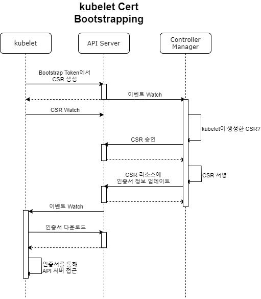 kubelet도 마찬가지로 API 서버에 접근 가능한 Client 인증서 및 자체 Server 역할을 위한 인증서를 필요로 한다. 다행히 관리자가 직접 인증서를 생성하거나 승인하는 대신, kubelet이 클러스터에 Join하는 시점에 임시 토큰값(Bootstrap token)을 통해 자동으로 발급된다. 특히 Controller Manager에선 CSR을 요청한 주체가 kubelet일 경우, 자동으로 승인 및 발급이 이루어지도록 설계되어 있다. 이를 Sequence Diagram으로 표현하면 다음과 같다.