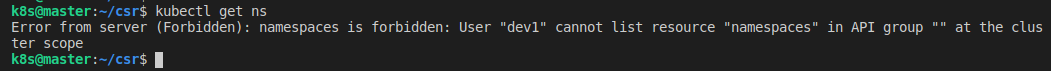 여기까지 진행했으면, 새로 추가한 사용자 'dev1'으로 기존 클러스터 'kubernetes'에 접근할 수 있다. 다만 RBAC 설정을 하지 않은 상태이므로, 대부분의 명령어는 실패한다.