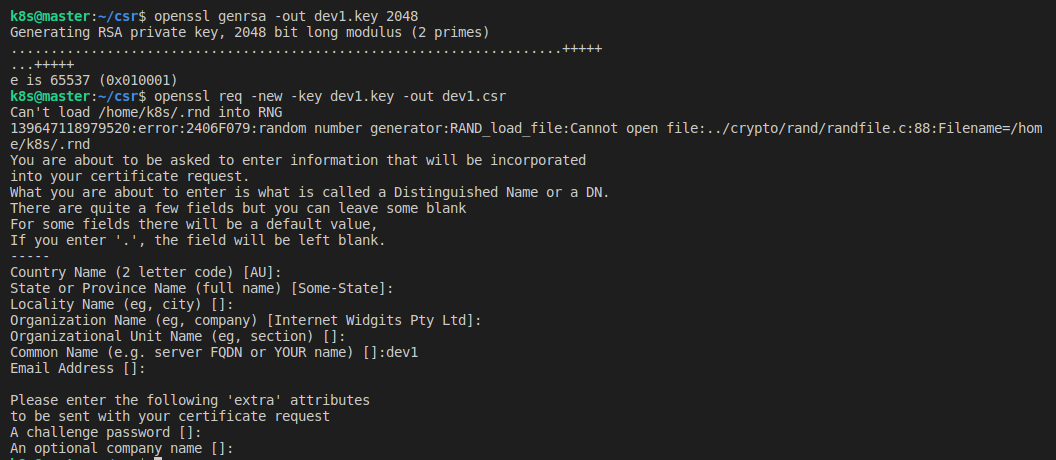 CSR 파일 생성시, Common Name에 새로 추가할 사용자의 이름을 입력하며 그 외 항목은 생략한다. 이 과정에서 dev1.key, dev1.csr 두 개의 파일이 생성된다.