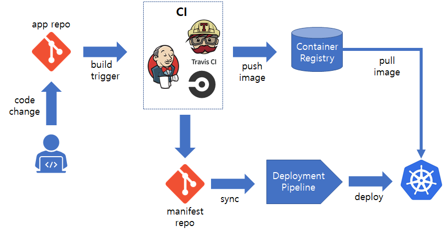 개발자의 코드가 실제 서비스로 반영되기까지 많은 과정을 거쳐야 한다. Repository에 Push 후 CI를 통해 Docker Image로 빌드되고, Container Registry(ex: DockerHub)로 업로드하면 CI 과정은 끝나며 이후부턴 Kubernetes에 어떻게 배포할지 고민이 필요하다.