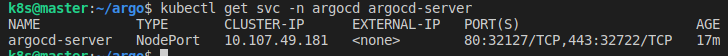 웹콘솔 접근을 위해 argocd-server의 Service 타입을 ClusterIP에서 NodePort로 변경하여 클러스터 외부에서 접근할 수 있게 한다. 현재 테스트 환경의 k8s는 Desktop의 VM 위에 구축되었기 때문에, Load Balancer 대신 NodePort를 사용한다.