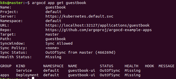 우리가 방금 만든 guest App이 OutOfSync 상태인 것을 확인할 수 있다. 참고로 웹 콘솔이 아닌 CLI에서도 App 정보를 확인할 수 있다.
