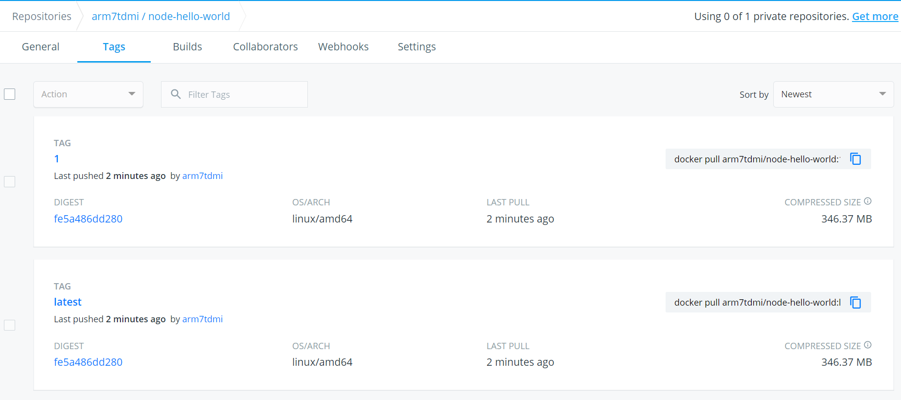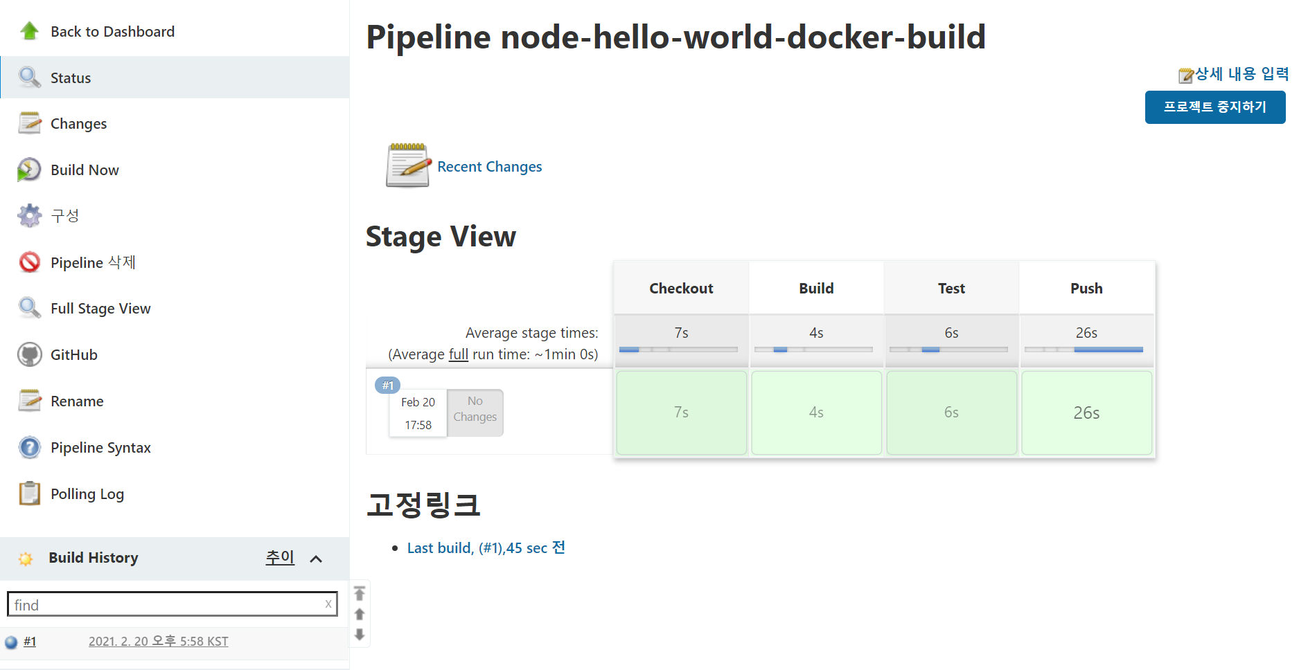 Build Number가 #1이었고 latest 태그도 추가하기로 했으니 우리가 Jenkinsfile에 정의한 내용과 일치한다. 이로써 기본적인 CI 과정은 기본적인 뼈대는 구현한 셈이다.