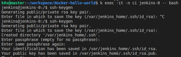 Jenkins Master 서버의 Container 안으로 들어가서 SSH Key를 생성한다.