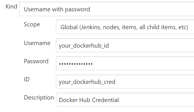 Docker Hub는 SSH Key 대신 'Username with password' 타입의 Credential을 추가한다. Docker Hub 로그인시 사용하는 ID와 비밀번호를 의미한다.