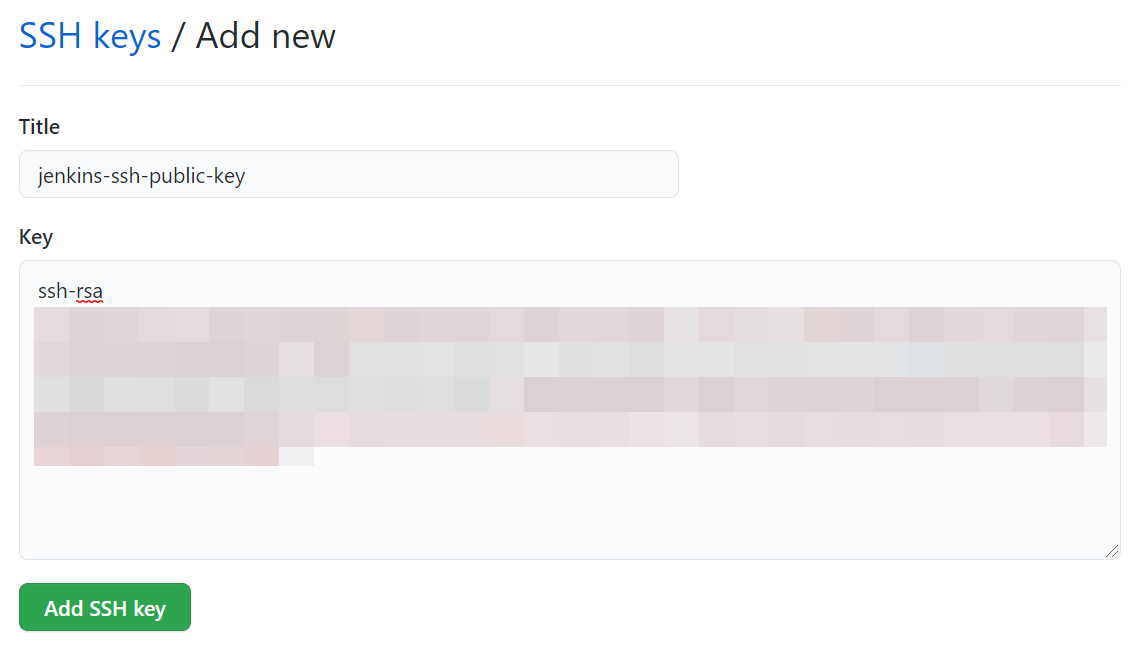 Public Key(/var/jenkins_home/.ssh/id_rsa.pub) 파일 내용은 GitHub > 'Accout settings' > 'SSH and GPG keys' 메뉴를 통해 등록할 수 있다.