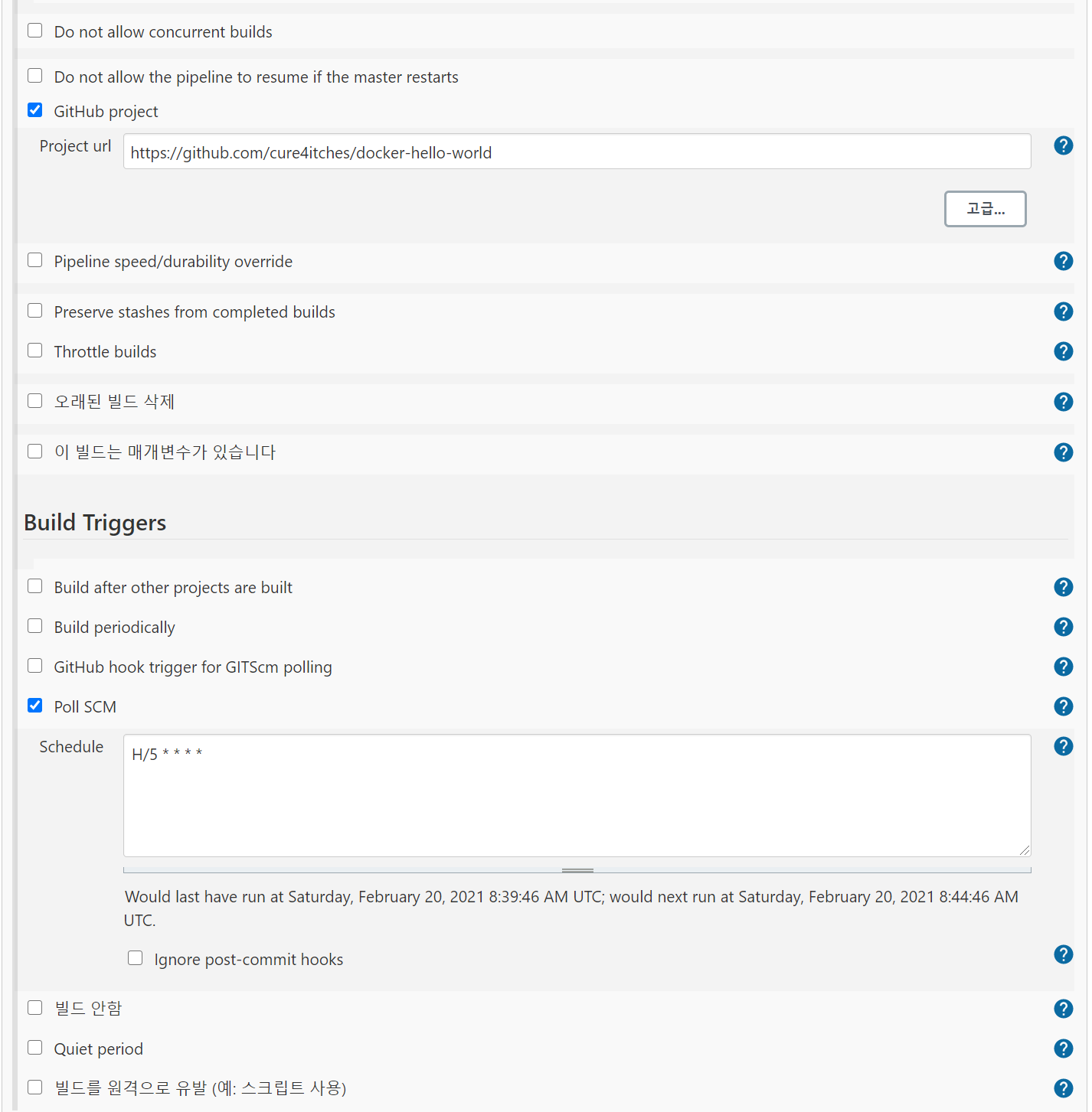 - Poll SCM: 5분마다 Repository를 polling하도록 설정("H/5 * * * *")한다. 실제 환경이라면 Poll SCM 대신 GitHub Webhook을 통해 빌드 트리거를 설정해야 하지만, 현재 환경은 외부에서 Jenkins에 접근할 수 없으므로 이 방식을 사용한다.
