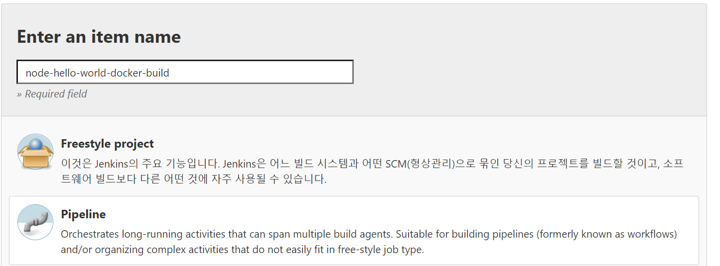 이제 이 파일을 저장, Commit 후 GitHub에 Push했다면 Jenkins Job을 추가할 차례다. 먼저 아래와 같이 Pipeline Job을 하나 생성하자.