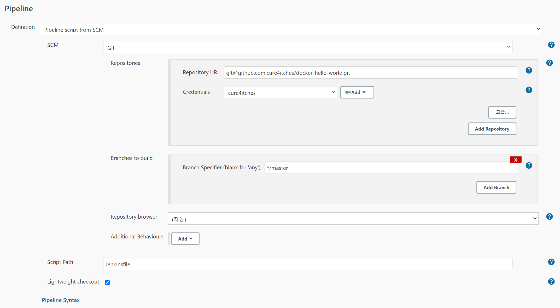 마지막으로 Pipeline 설정이다. 체크아웃할 Repository에 이미 Pipeline Script이 존재하므로 'Pipeline script from SCM' 항목을 선택한다. Repository URL은 해당 Repository URL(.git 포함)을 입력하고, Credential은 미리 생성한 GitHub Credential을 사용한다. 빌드할 대상 브랜치는 master이다.
