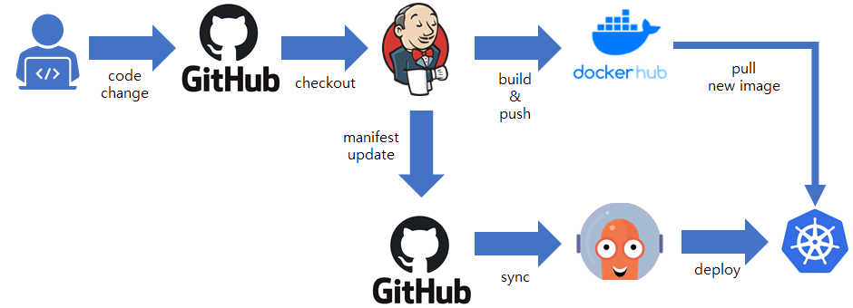 이전 포스트에서 Jenkins, GitHub, Docker Hub를 파이프라인으로 구성하여, 컨테이너 이미지 빌드를 자동화하였다. 이번 시간엔 Argo CD를 연계하여 배포까지 자동화된 CI/CD Pipeline을 만들어 볼 차례다.