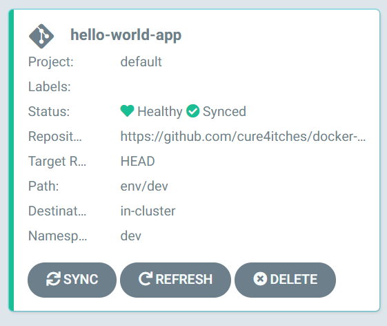Argo CD가 ./env/dev 디렉토리로부터 kustomize를 실행하여 'dev' Namespace에 관련 리소스를 생성하는 방식으로 Application 배포가 이루어진다. 잠시 기다린 후 'hello-world-app'의 상태를 확인해보자.