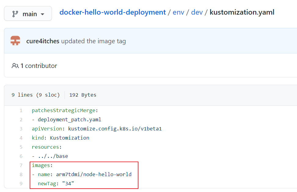 이제 확인해볼 것은 kustomization 파일이다. 과연 이미지 태그가 빌드번호인 34로 업데이트 되었을까?