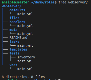 보통 Role은 아래와 같은 파일 계층으로 구성된다. 예를 들어, webserver 라는 Role이 있다고 가정하자.
