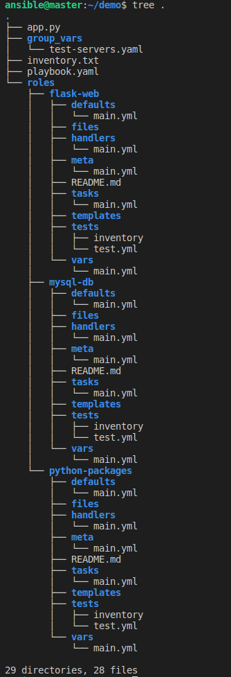이제 mysql-db Role을 사용하는 playbook은 자동으로 main.yaml에 정의한 Task를 가져오게 된다. 다음은 같은 방법으로 flask-web role을 생성한다. tasks 디렉토리는 이제 더 이상 사용하지 않기 때문에 삭제한다.