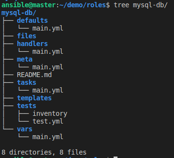 저번 실습에선 include 키워드를 통해 다른 파일에 위치한 task들을 가져왔다. 이번엔 flask-web, mysql-db role을 생성하고 Playbook에서 이를 불러오는 방식으로 수정해보자. 우선 roles 디렉토리를 만들고, 그 밑에 아래 명령어를 사용하여 mysql-db role을 생성 및 초기화한다.