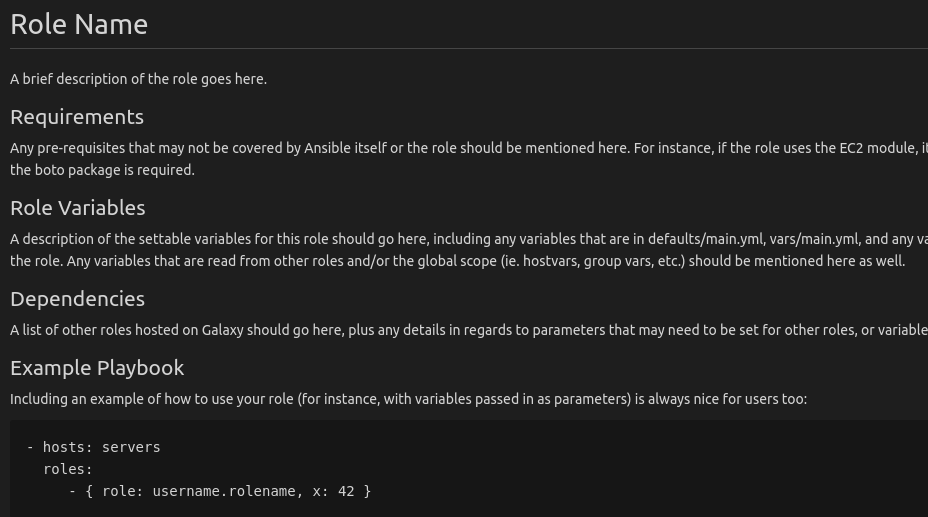 README.md는 GitHub에 Role을 업로드을 때 메인으로 출력되는 파일이며, ansible-galaxy 명령어를 통해 기본 템플릿이 작성된 상태이다.