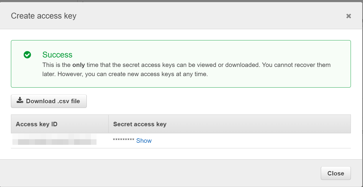 AWS 외부에서 Programmatic access가 가능하도록 Security Credential 탭에서 Access Key를 추가한다. Secret access key는 생성시에만 조회 가능하므로 .csv 파일을 반드시 다운로드하자. 보안을 위해 Access key는 그 누구와도 공유해선 안된다.