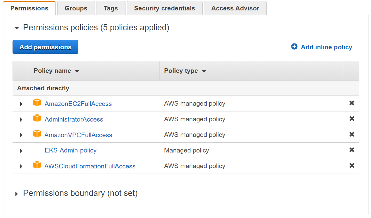 이번엔 'eks-admin'에 EKS 사용을 위한 Permission 설정을 할 차례다. 해당 IAM User에 아래와 같이 5개의 Policy를 적용한다.