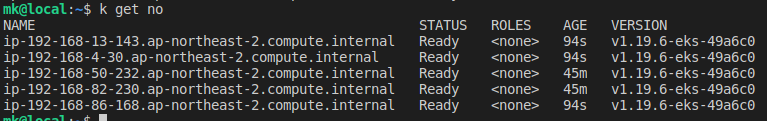 1~2분 정도 더 기다린 뒤, 'kubectl get no' 명령어로 K8s Worker Node를 체크해보았다.