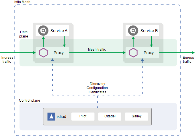 - Envoy proxy: C++로 개발된 고성능, 경량화 proxy로 모든 Service Mesh 내 서비스의 모든 inbound/outbound 트래픽을 중재한다. Istio의 Data Plane은 envoy proxy들로만 구성된다.