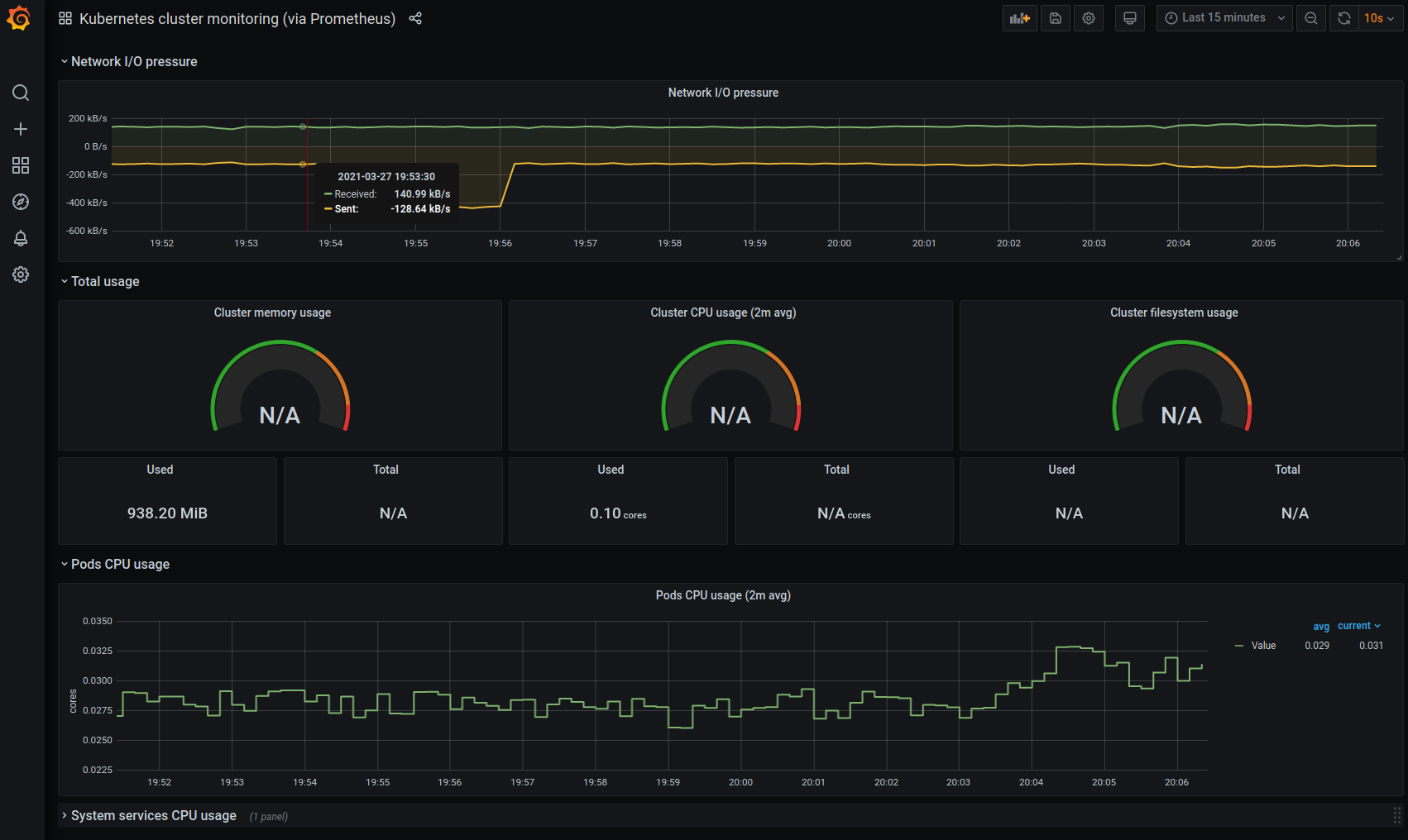 새로 생성한 Dashboard를 통해 아래와 같이 K8s 클러스터의 리소스 사용량을 조회할 수 있다.