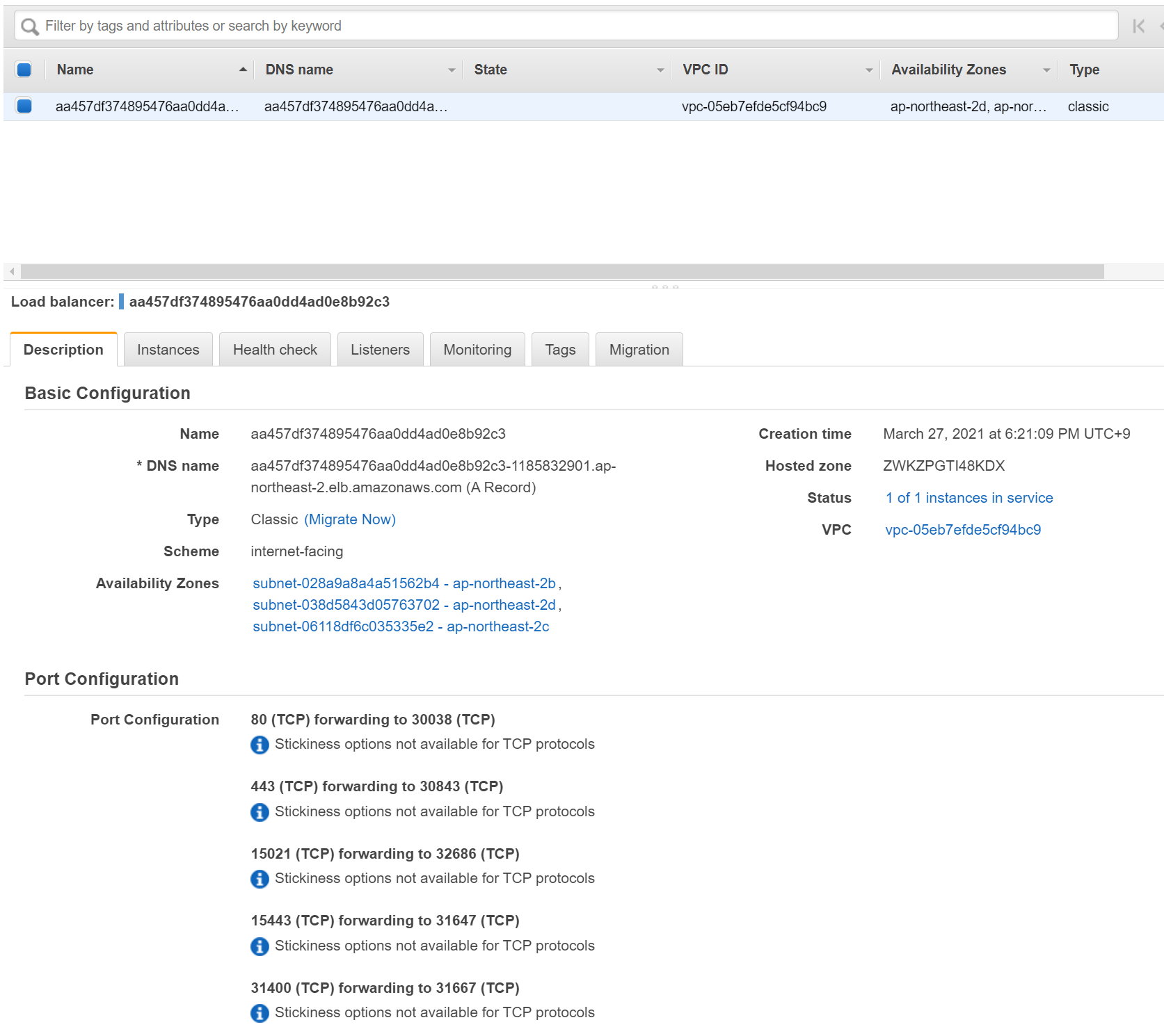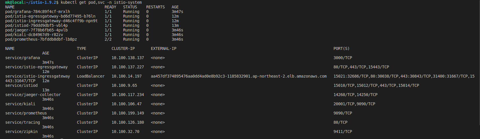 Istio 관련 모든 리소스가 정상적으로 생성되었으며, 특히 'istio-ingressgateway' 서비스의 경우, Loadbalancer 타입의 Service로 AWS ELB를 통해 외부에서 접근이 가능하다.