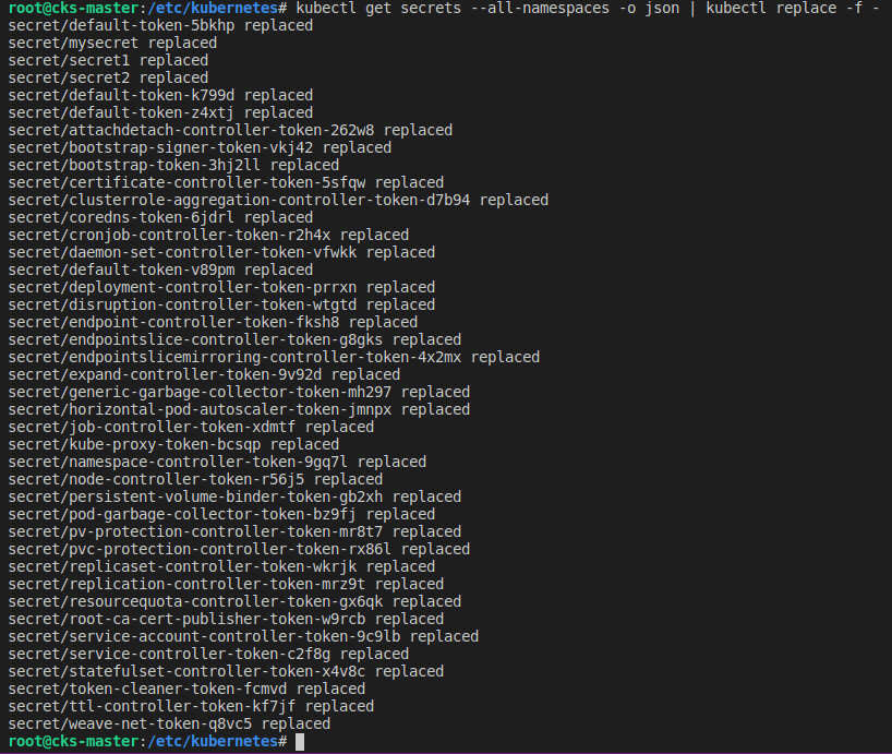 kubectl get secrets --all-namespaces -o json | kubectl replace -f -