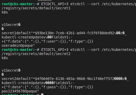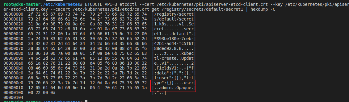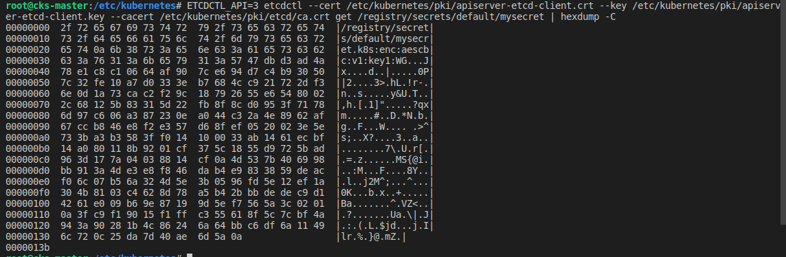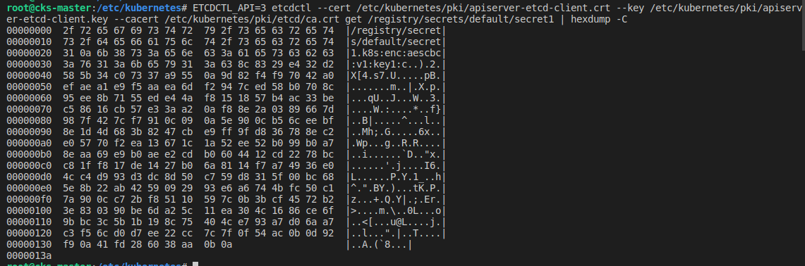 ETCDCTL_API=3 etcdctl --cert /etc/kubernetes/pki/apiserver-etcd-client.crt --key /etc/kubernetes/pki/apiserver-etcd-client.key --cacert /etc/kubernetes/pki/etcd/ca.crt get /registry/secrets/default/secret1