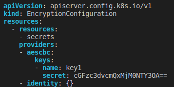 - provider에 어떤 알고리즘(ex: aescbc, aesgcm, etc)과 key를 사용해서 암호화할지 정의한다. provider의 순서가 매우 중요한데, 암호화시 항상 처음 위치한 provider를 사용하기 때문이다. 만약 identity를 첫번째 provider로 정의시, Plain Text로 저장되므로 주의해야 한다.