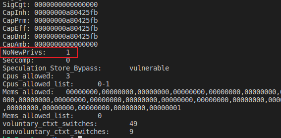 이 설정이 적용되었는지 확인하기 위해선, 컨테이너 내부에서 'cat /proc/1/status' 명령어 실행 후 'NoNewPrivs' 값이 1인지 보면 된다.
