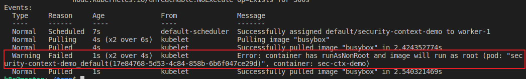 주의할 점으로, Container Image의 기본 사용자가 이미 root로 설정되어 있다면 다음과 같이 Pod을 생성할 수 없다.