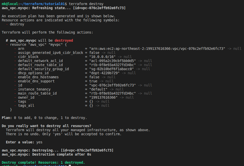 'terraform destroy' 명령어를 사용하여, 모든 리소스를 제거할 수 있다. 지금은 간단한 튜토리얼이므로 별 문제가 없으나, 실제 운영 환경에서 이 명령어는 돌이킬 수 없는 결과를 초래하므로 매우 신중하게 사용해야 한다. 'terraform apply'와 마찬가지로 사용자의 의사를 확인하는 프롬프트에서 'yes'를 입력한다.