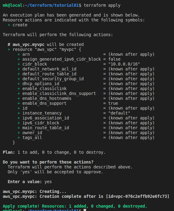'terraform plan' 명령어에서 에러가 없었다면, 다음은 실제로 리소스를 생성할 차례다. 'terraform apply' 명령어를 사용하여 VPC를 추가하고, AWS 콘솔에서 실제 정의한 값과 동일한지 비교해보자. 작업 수행시, 사용자에게 확인을 요구하므로 'yes'를 입력한다.