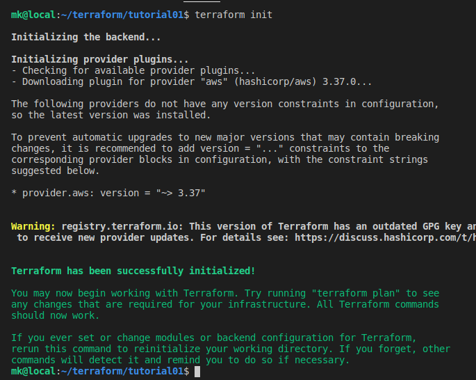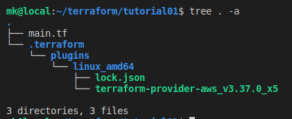 리소스 생성에 앞서, 현재 디렉토리(tutorial01)을 Terraform 프로젝트용으로 만들어야 한다. 'terraform init' 명령어를 사용하면 다음과 같은 메시지가 출력되며, .terraform 디렉토리 안에 'aws' provider 플러그인을 다운로드하는 것을 알 수 있다.