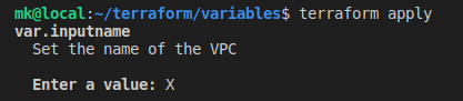 variable 정의시 default 필드가 존재하지 않는 경우, 사용자에게 직접 입력을 받는 프롬프트가 발생한다. 예를 들어 string 타입의 변수를 사용자에게 입력받아야 하는 경우, 다음과 같이 variable을 정의한다.