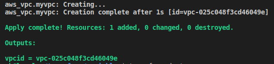 terraform 수행 후 결과를 사용자에게 출력해야 한다면, output 키워드를 사용한다. 다음은 "myvpc" VPC의 id를 출력하는 예시이다.