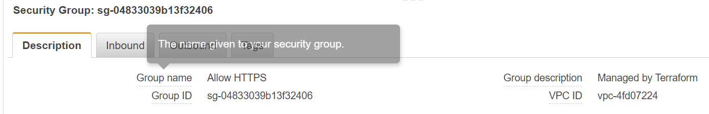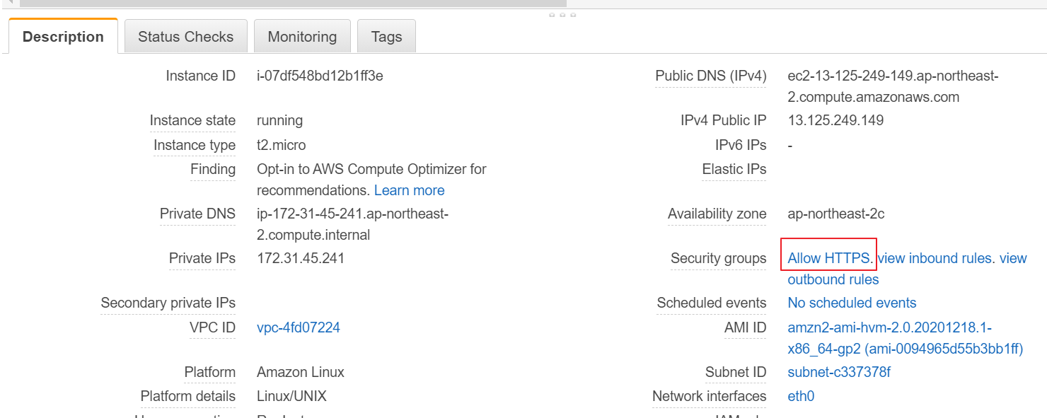 AWS 콘솔에서도 새로 생성된 Security Group 'Allow HTTPS'와 이를 사용하는 EC2 인스턴스를 확인 가능하다.