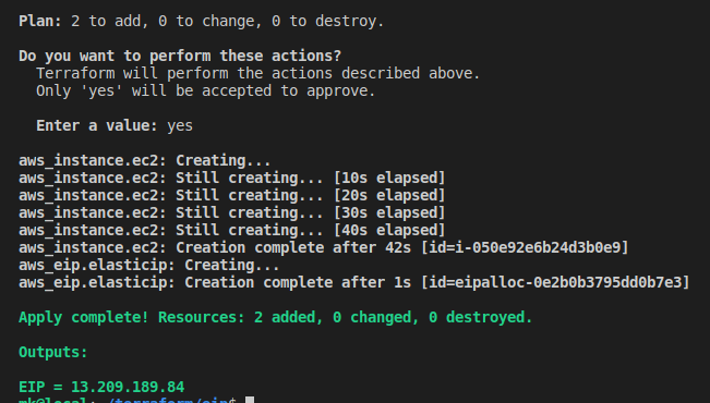 aws_eip는 EIP를 추상화한 리소스로, instance 필드에 ec2 인스턴스 ID를 지정함으로써 어떤 instance에 할당될지 결정할 수 있다. 작업이 완료되면, EIP라는 이름으로 'elasticip'의 Public IP가 콘솔에 출력된다. 다음은 'terraform apply' 명령어 수행결과이다.