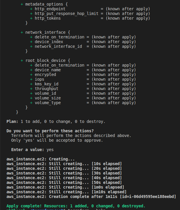 다음은 'terraform apply' 결과이다. 인스턴스가 바로 생성되지는 않고, 30초에서 1분 정도 소요된다.