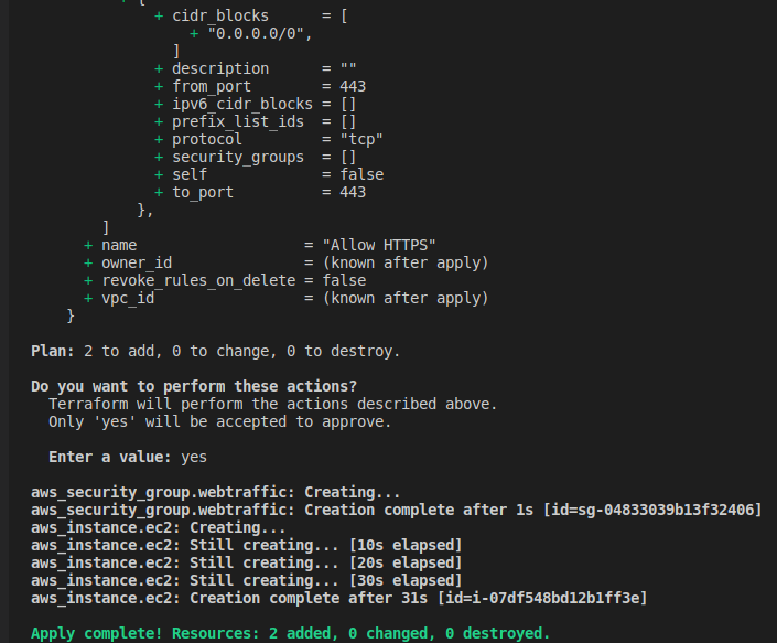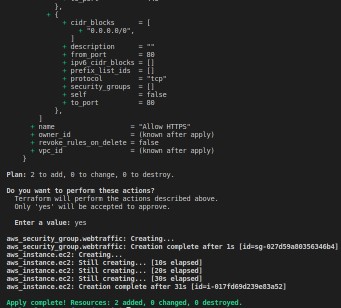 우선 list(number) 타입의 변수인 ingressrules와 egressrules를 정의한다. 그리고 aws_security_group.webtraffic의 ingress와 egress 필드를 위와 같이 작성한다. 'port'는 for_each loop을 통해 list에서 가져오는 각각의 value를 담을 수 있는 iterator이다. 결과적으로 ingress, egress 모두 list 타입으로 생성될 것이다. 다음은 'terraform apply' 명령어 결과이다.