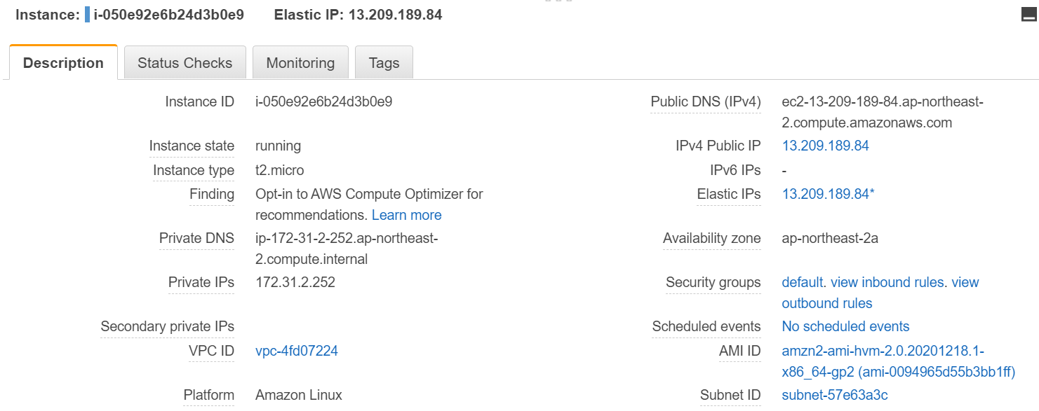실제 AWS 콘솔에서 확인한 EC2 인스턴스도 동일한지 확인해보자. Elastic IP '13.209.189.82'가 할당된 것을 알 수 있다.