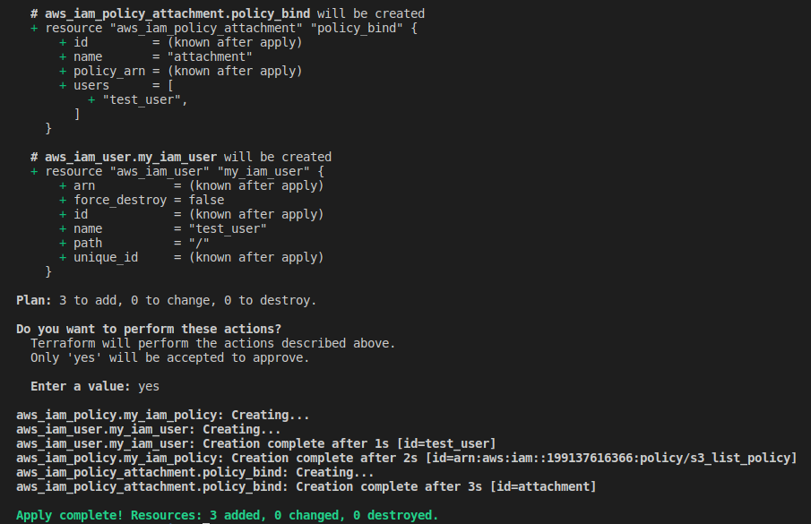 'terraform init' 명령어로 해당 디렉토리를 초기화 한 뒤, 'terraform apply' 명령어를 수행해보자. IAM User와 Policy가 생성되는 것을 볼 수 있다.