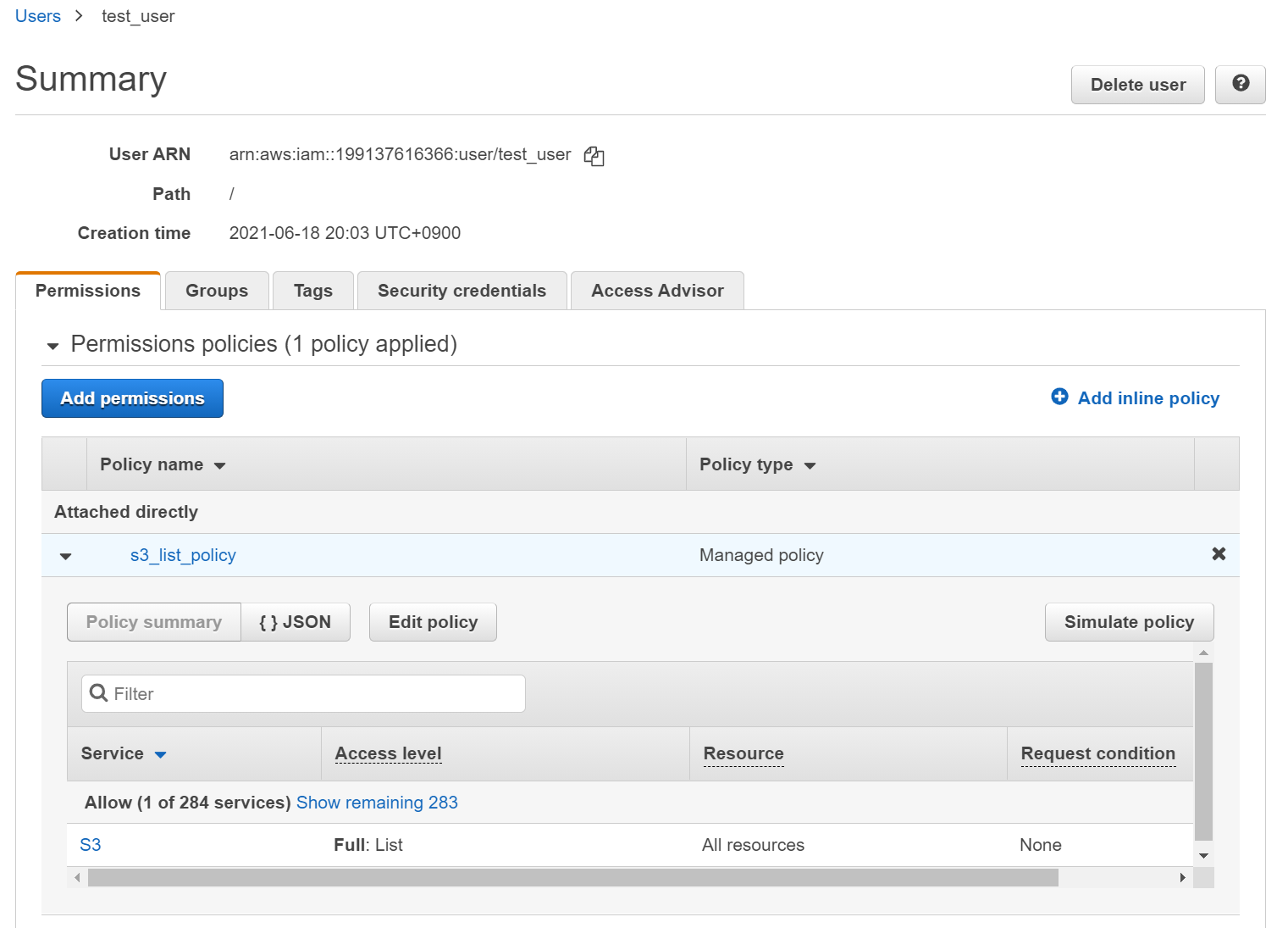 AWS 콘솔에서 실제 결과를 확인해보자. IAM Policy 's3_list_policy', 그리고 IAM User 'test_user'가 다음과 같이 생성되었으며, binding 역시 성공적으로 이루어졌다.