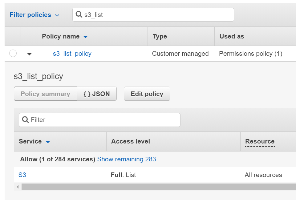 이번 시간엔 Terraform을 통해 IAM User와 Policy를 생성하고 이를 Binding하는 동작을 Terraform으로 정의해보자. 우선 모든 S3 리소스에 대해 모든 List 동작을 수행하는 Policy를 다음과 같은 JSON 포맷으로 정의할 수 있다.